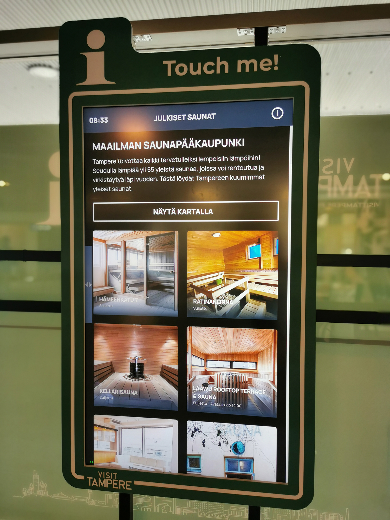 Ympäri Tamperetta on jo useamman vuoden ajan ollut kymmenkunta kosketusinfonäyttöä, joissa esitellään Tampereen kohdetietoja. Toukokuussa Tampereen kaupunki ja Visit Tampere toteuttivat yhteistyössä uudistuksen, jonka yhteydessä toteutettiin tietojen tuonti näyttöihin muiden lähteiden lisäksi myös DataHubista nopealla ja vaivattomalla integraatiolla.
